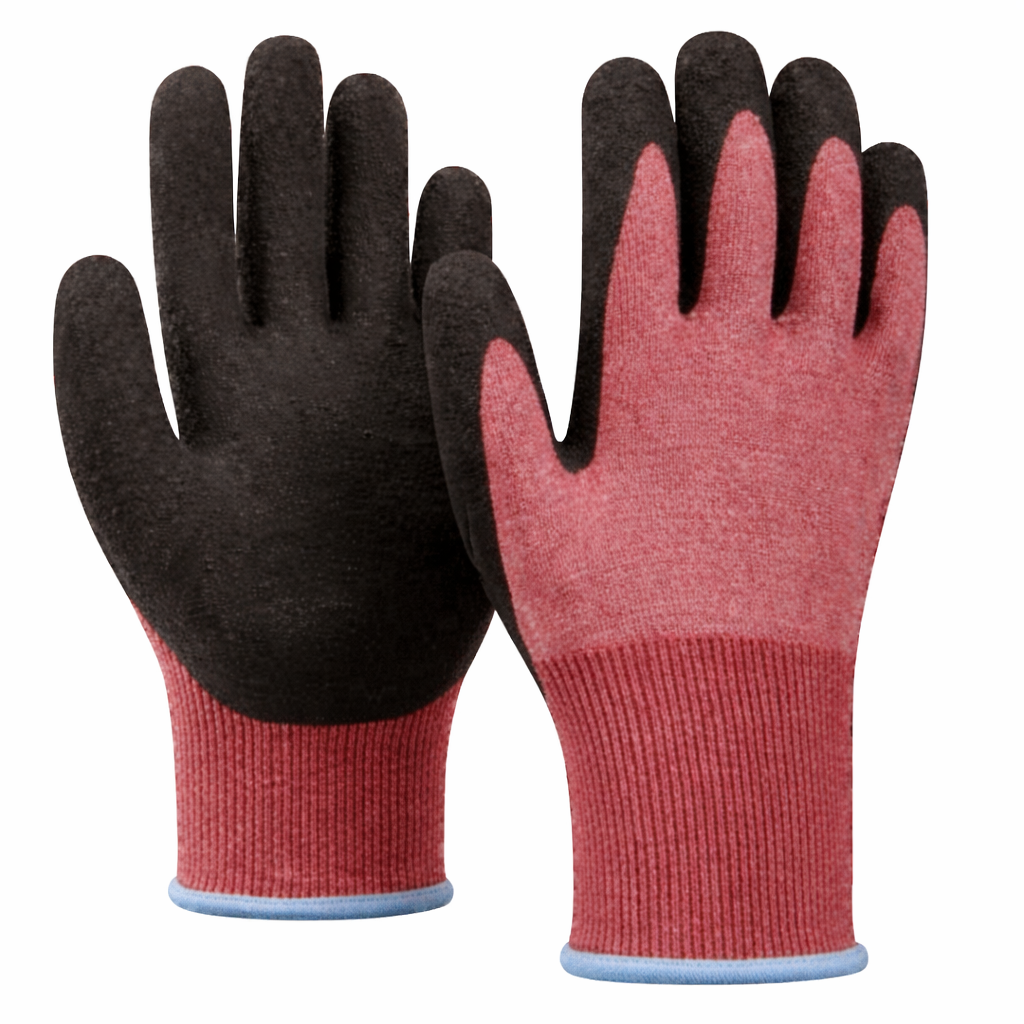 The product is finished in red, a neutral tone chosen to minimize visual wear and maintain a clean appearance in industrial workplaces. These gloves are particularly suited for applications including but not limited to: handling sharp objects, construction work, assembly lines, and general industrial applications.