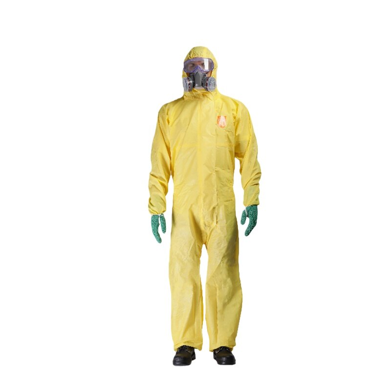 The coverall includes a hood, stitched seams, and a front zipper closure. Elastic wrist cuffs improve the seal without restricting motion.